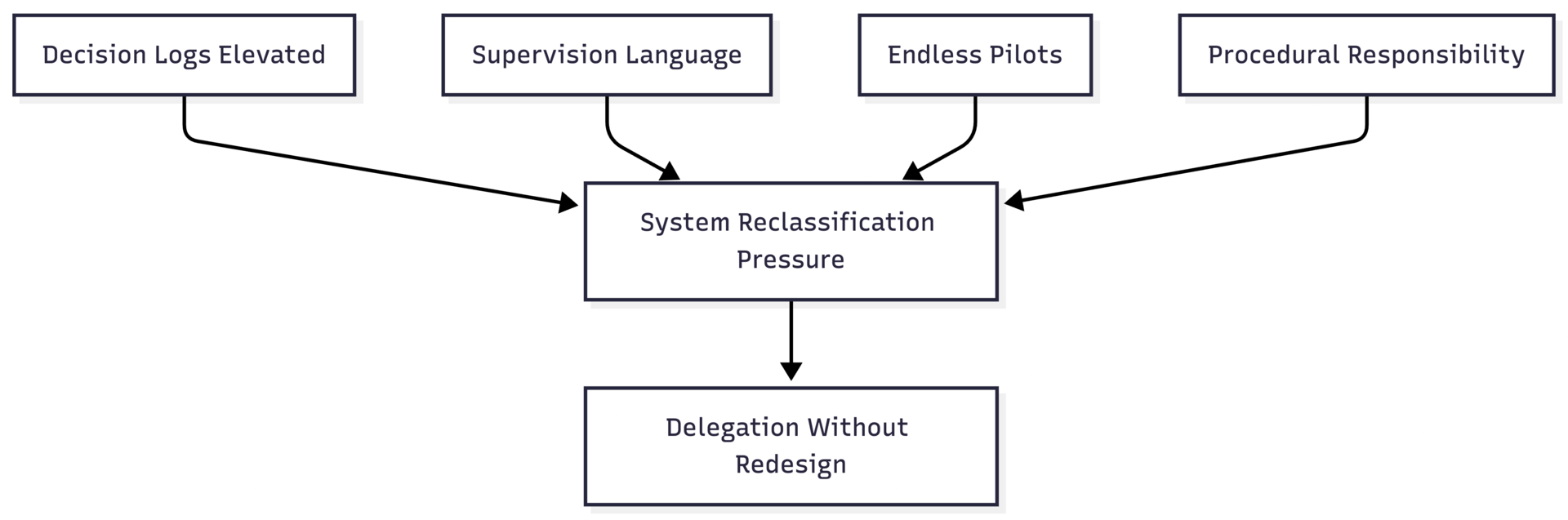 At no point does anyone explicitly decide to delegate responsibility to the system. And yet, when outcomes occur, responsibility has already moved.
